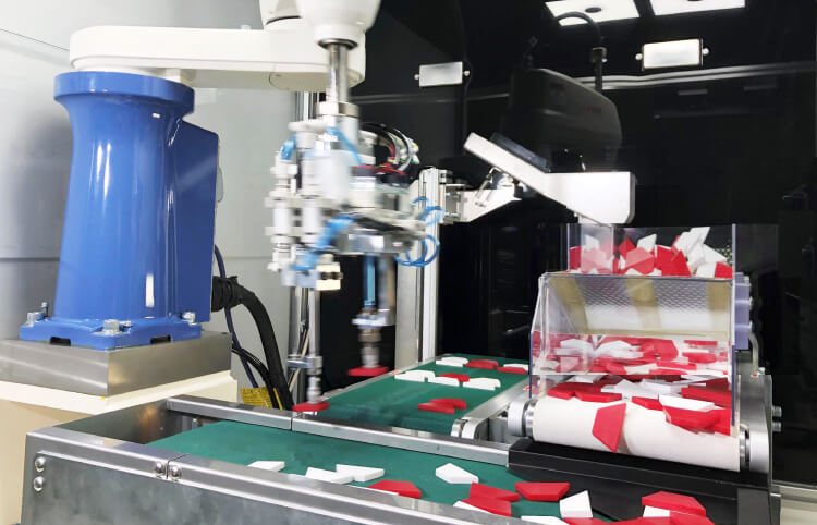 - ロボットアームが部品をピッキングして次の工程に部品を流す